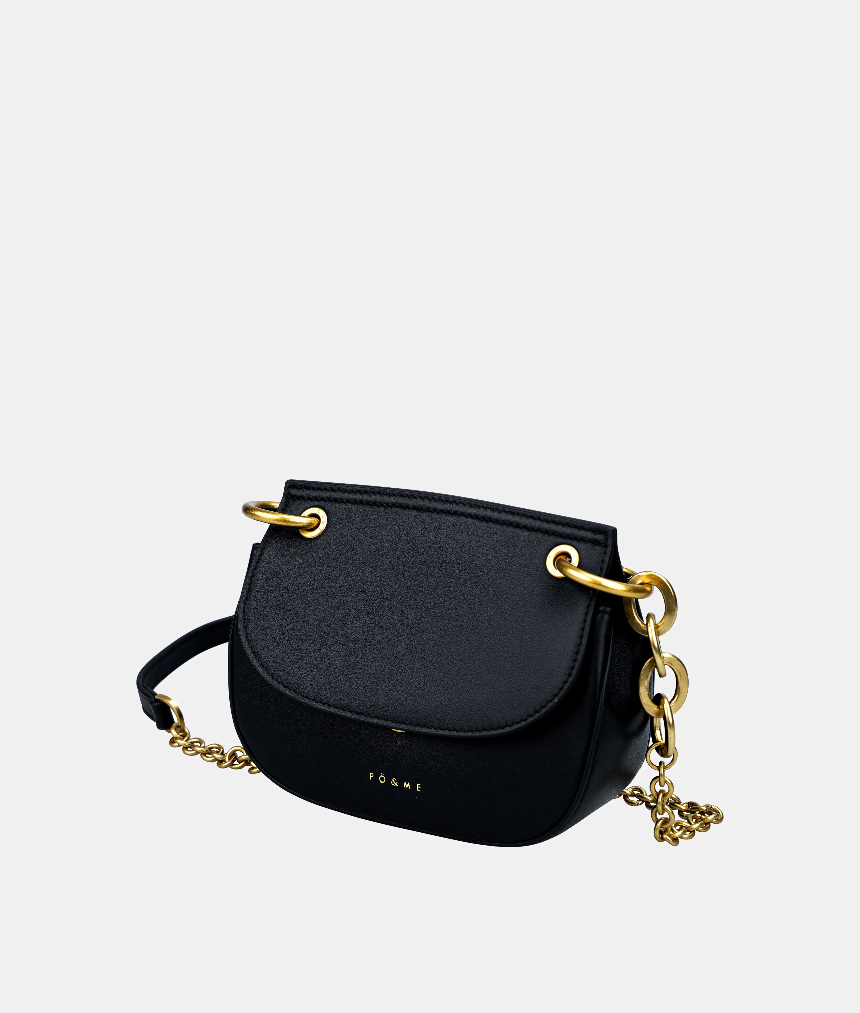 - Porté : Bandoulière en chaîne et cuir ajustable, idéale pour un porté épaule ou en travers du corps. Anse en cuir siglée PÖ&ME, amovible pour transformer le sac en minaudière élégante